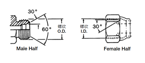 日標30°擴口外螺紋接頭僅與日標30°擴口內螺紋接頭相配。外螺紋接頭和內螺紋接頭都有螺紋和30°錐面。密封是通過30°錐面來實現的。日標30°擴口接頭符合JISB0202標準,與英制BSPP螺紋一樣。英制接頭和日標接頭也都有30°錐面,但是他們不能互換使用,因為英制錐面是相反的。