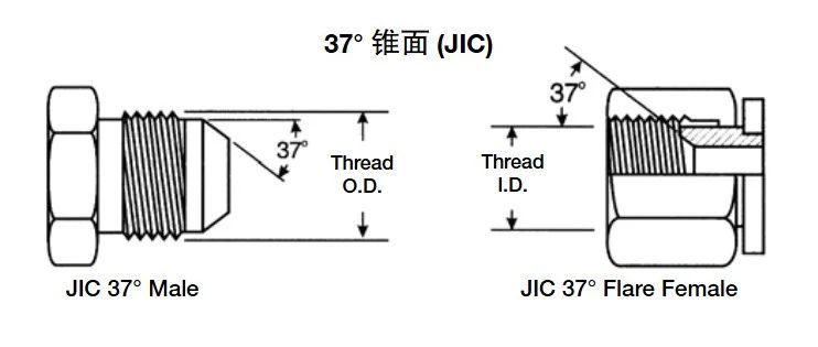 美國汽車工程師協會(SAE)確定37°擴口或錐面用于高壓液壓管的密封。這種設計通常稱為JC接頭。JIC 37°外錐僅與37°內錐匹配。JIC外螺紋為直螺紋并有37°錐面。JIC內螺紋為直螺紋并有37°錐面。密封由37°內、外錐面之間形成的線密封來完成。螺紋實現機械連結。