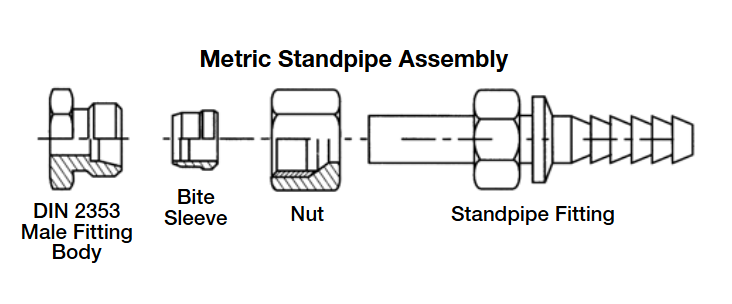 一個公制直管接頭由三個附件和外螺紋接頭體組成。三個附件為鋼管,卡套和卡套螺母。三者裝配關系如下圖所示。DIN輕系列裝配,使用DIN輕系列公制螺母。DIN重系列裝配,使用DIN重系列公制螺母。根據鋼管外徑選擇卡套和鋼管。