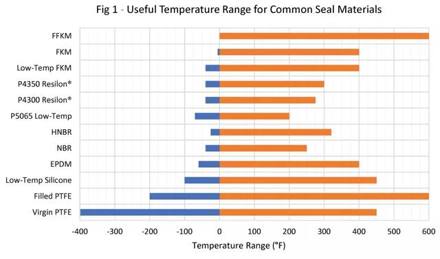 純(未填充的)PTFE雖然不被視為彈性體,但它在低至-425°F的溫度下卻仍有柔韌性,這一溫度只比絕對零度(可達到的最低溫度)高35度。圖1中的圖表展示了派克密封材料的有效范圍。