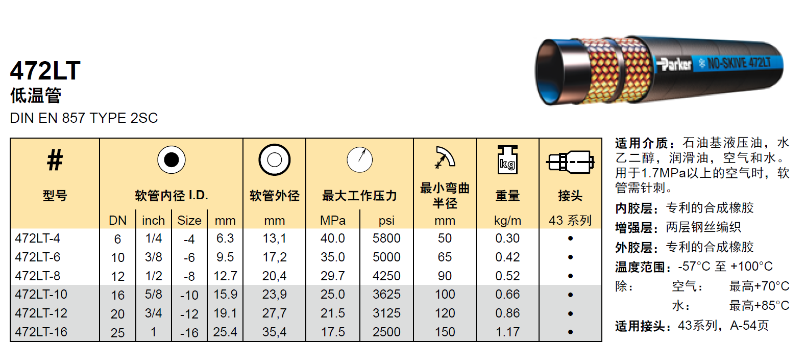 常規(guī)液壓軟管的額定工作溫度最低為–40°C,而Parker的低溫液壓軟管,可以達(dá)到-57°C。